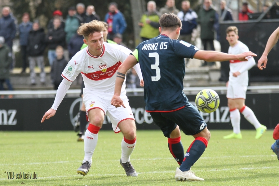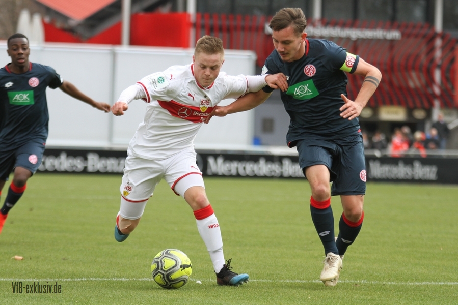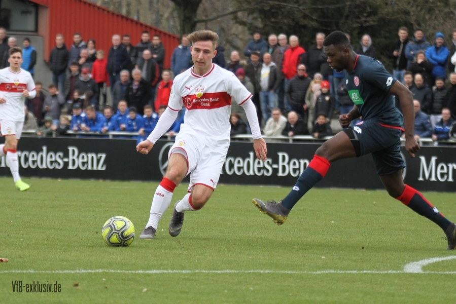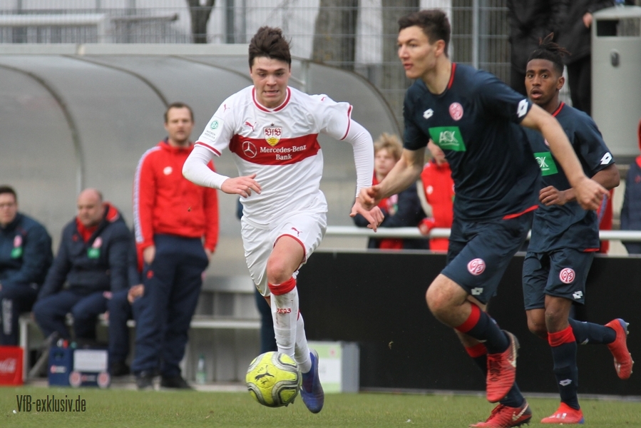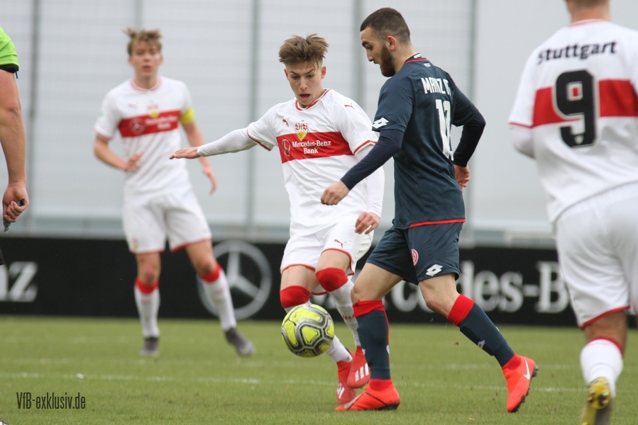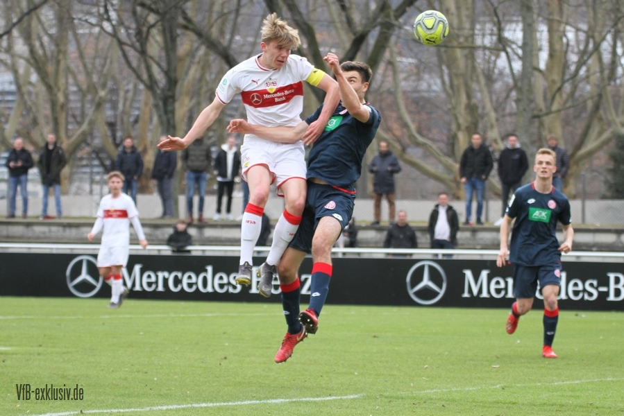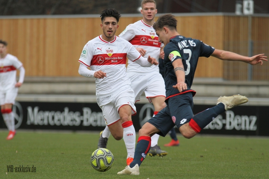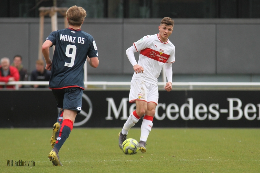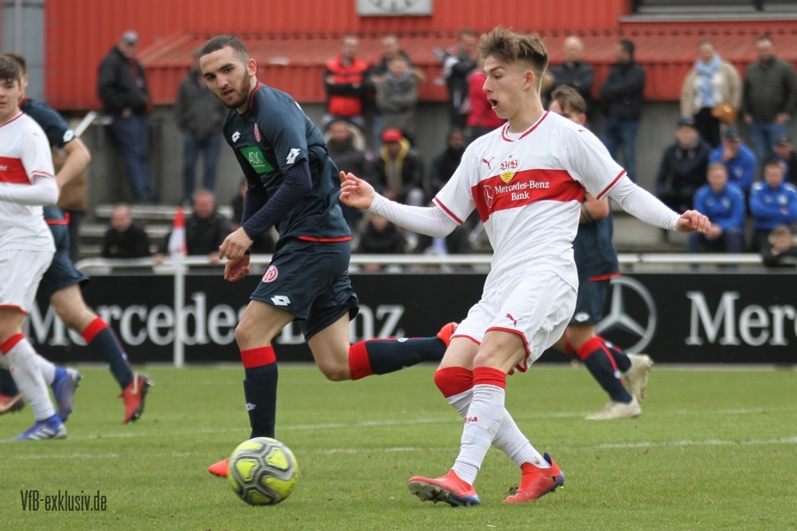 In der Vorrunde konnte der VfB gegen die beiden Verfolger nicht punkten. Mainz und Bayern gingen verloren. Das Szenario droht sich zu wiederholen. Der VfB ging als Tabellenführer ins Spiel und war auch danach noch auf Platz eins. Doch Mainz ist durch den 3:1-Erfolg am Samstagnachmittag bis auf zwei Punkte an die Jungs von Nico Willig herangerückt. Dazu haben sie noch ein Spiel weniger gespielt. Unter den Zuschauern war Sportvorstand Thomas Hitzlsperger, Andreas Hinkel, Halil Altintop und U17-Co-Trainer Tobias Rathgeb. Der VfB und die Gäste schenkten sich in der ersten Halbzeit nicht viel, besseren Möglichkeiten hatte Stuttgart. In der zweiten Halbzeit war ebenfalls wieder Stuttgart die aktivere und spielstärkere Mannschaft. Doch Tore wollten erst nicht gelingen.