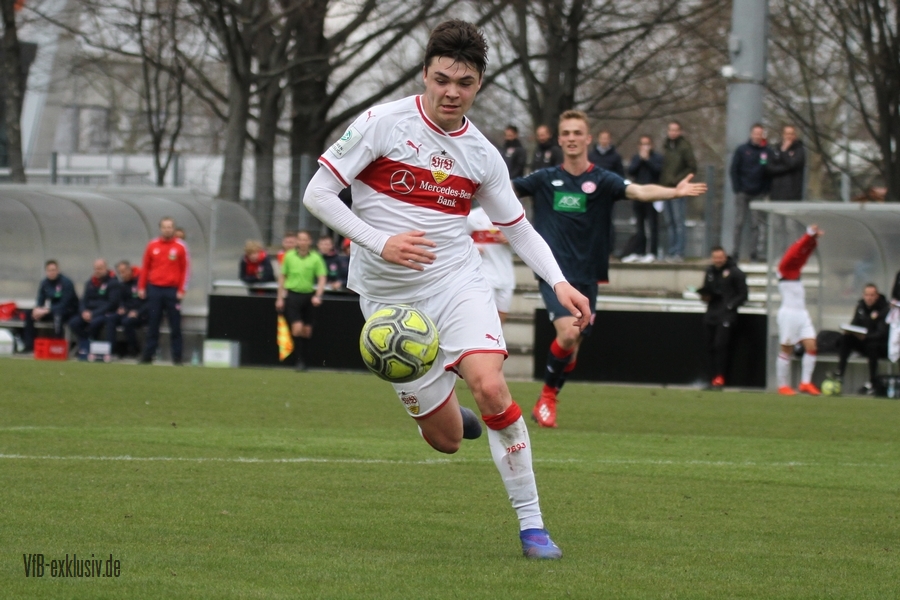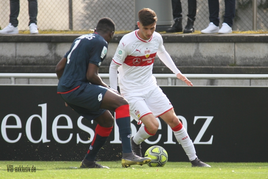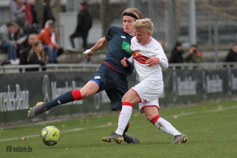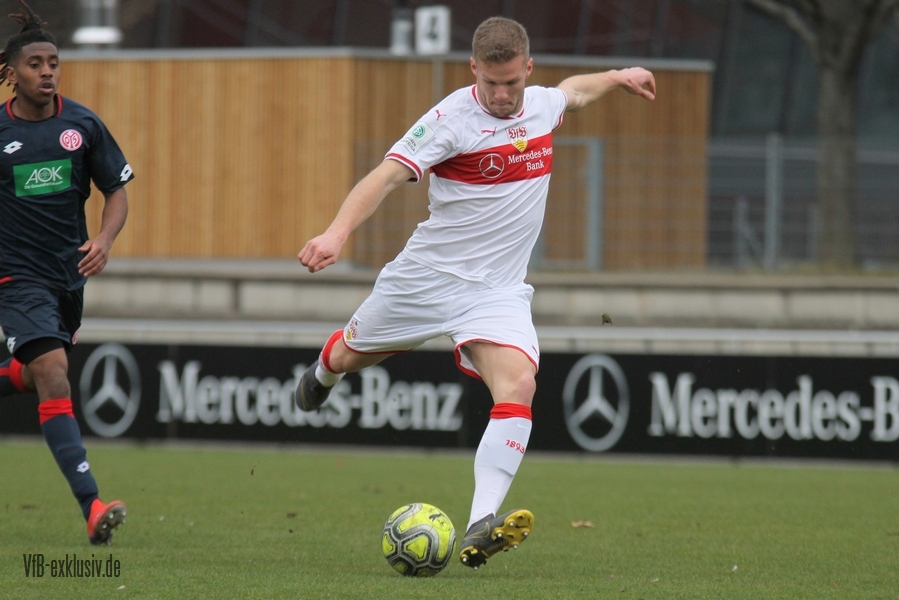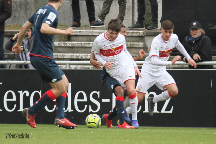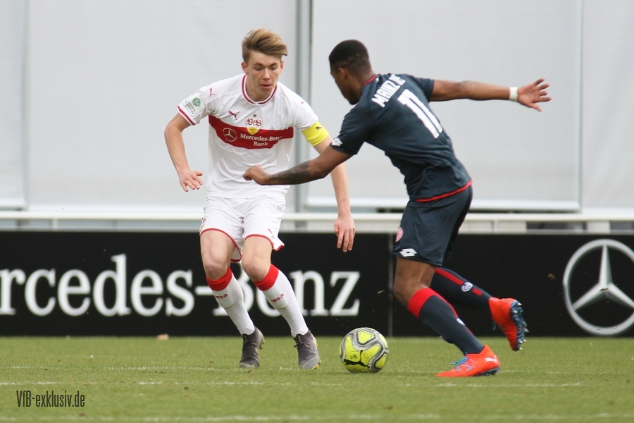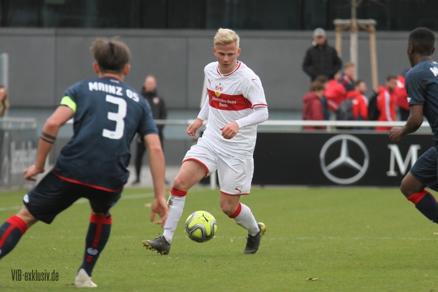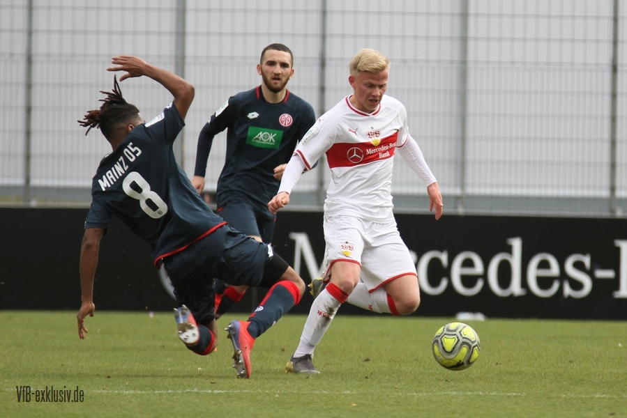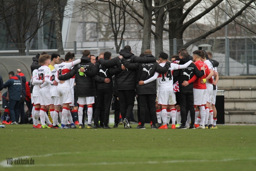 In der Vorrunde konnte der VfB gegen die beiden Verfolger nicht punkten. Mainz und Bayern gingen verloren. Das Szenario droht sich zu wiederholen. Der VfB ging als Tabellenführer ins Spiel und war auch danach noch auf Platz eins. Doch Mainz ist durch den 3:1-Erfolg am Samstagnachmittag bis auf zwei Punkte an die Jungs von Nico Willig herangerückt. Dazu haben sie noch ein Spiel weniger gespielt. Unter den Zuschauern war Sportvorstand Thomas Hitzlsperger, Andreas Hinkel, Halil Altintop und U17-Co-Trainer Tobias Rathgeb. Der VfB und die Gäste schenkten sich in der ersten Halbzeit nicht viel, besseren Möglichkeiten hatte Stuttgart. In der zweiten Halbzeit war ebenfalls wieder Stuttgart die aktivere und spielstärkere Mannschaft. Doch Tore wollten erst nicht gelingen.