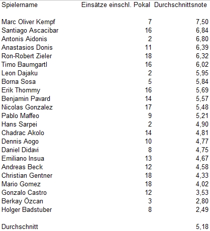 Die Besucher von VfB-exklusiv.de haben wie in den vergangenen Saisons, den VfB-Spielern Sterne für ihre jeweiligen Leistungen in den Pflichtspielen verteilt. Im Durchschnitt gab es gerade einmal etwas über fünf Sterne. Nur ein Spieler konnte im Schnitt seiner Einsätze über sieben Sterne erreichen. Seit Marc Oliver Kempf in der Abwehrreihe der Schwaben steht, sei es als Rechtsverteidiger oder Innenverteidiger, ist die große Gegentorflut ein wenig eingedämmt worden. Doch auch er ist nur ein Teil des Teams. Ausgerechnet beim letzten Gegentor der Hinrunde, patzte der U21-Europameister. Zwei Minunten nach dem Anschlusstor gegen Schalke war die erhoffte Aufholjagd bereits zu den Akten gelegt. Mit dem 1:3 der Knappen war das Spiel entschieden. Dennoch brachte Kempf wieder ein wenig Stabilität in die Defensive. Seine Zweikämpfe sind kompromislos, sein Stellungsspiel gegenüber seiner Konkurrenz im Kader besser.